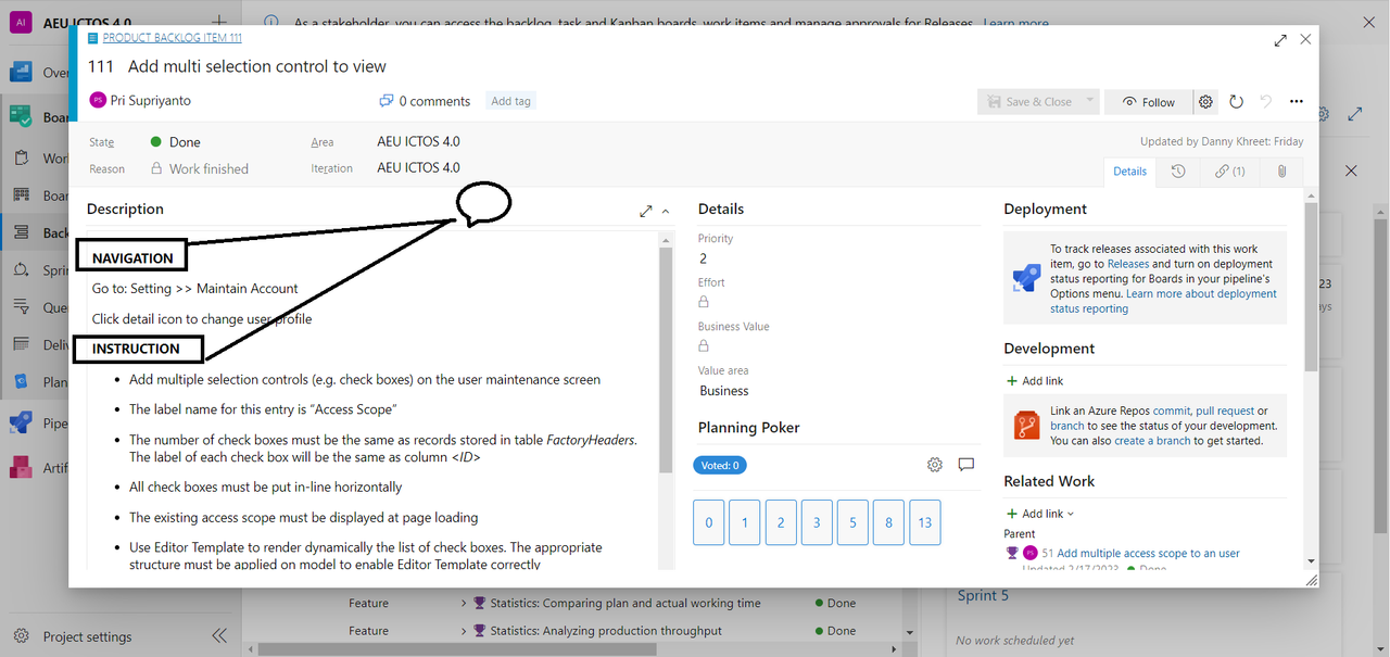 At the beginning of each sprint, the scrum team should define tasks, and each team member completes a portion of those tasks. Development, testing, and other types of work are examples of tasks. For instance, a tester may create tasks to write and execute test cases, and a developer might define tasks to implement PBIs (product backlog items). There are important description categories to define a task: 1. Navigation: This is showing how we can find the task in the product backlog.