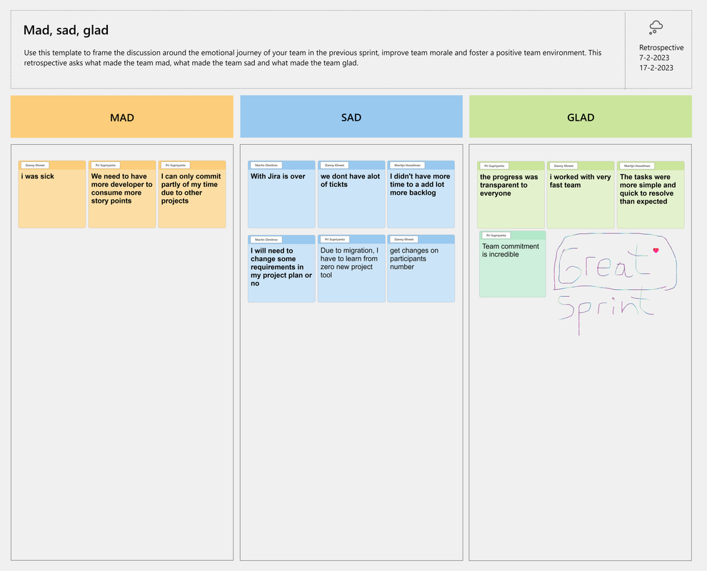 Review progress: Review progress from previous sprint retrospectives to ensure that actions have been taken and improvements have been made. You can improve the next sprint using the patterns you have found. The patterns that need to be improved most should be decided by the team. You can use Microsoft Teams board to review the progress during the sprint. Everybody can explain his viewpoint and he can propose solutions for the next sprint.